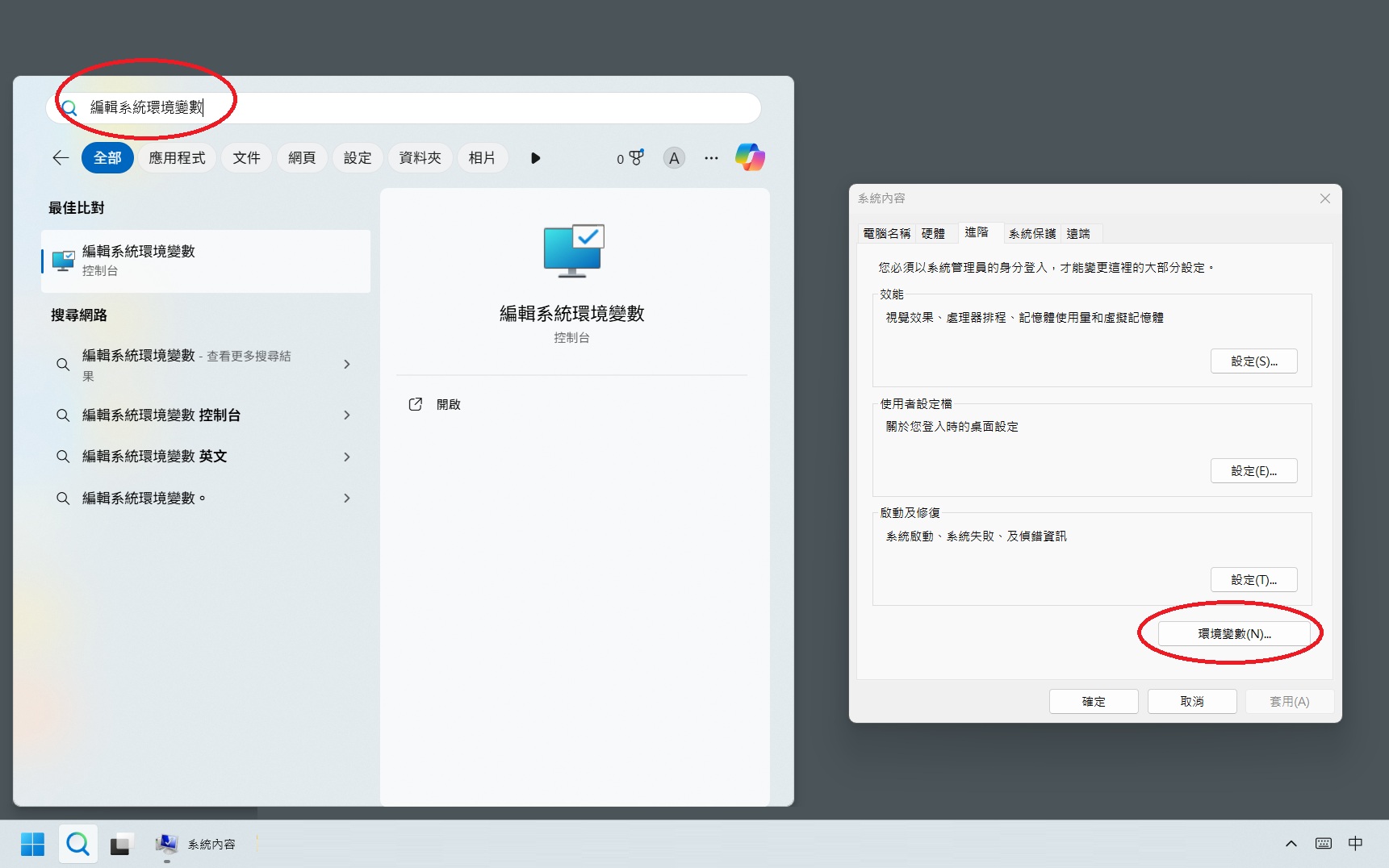 編輯系統環境變數 並開啟,點擊 環境變數