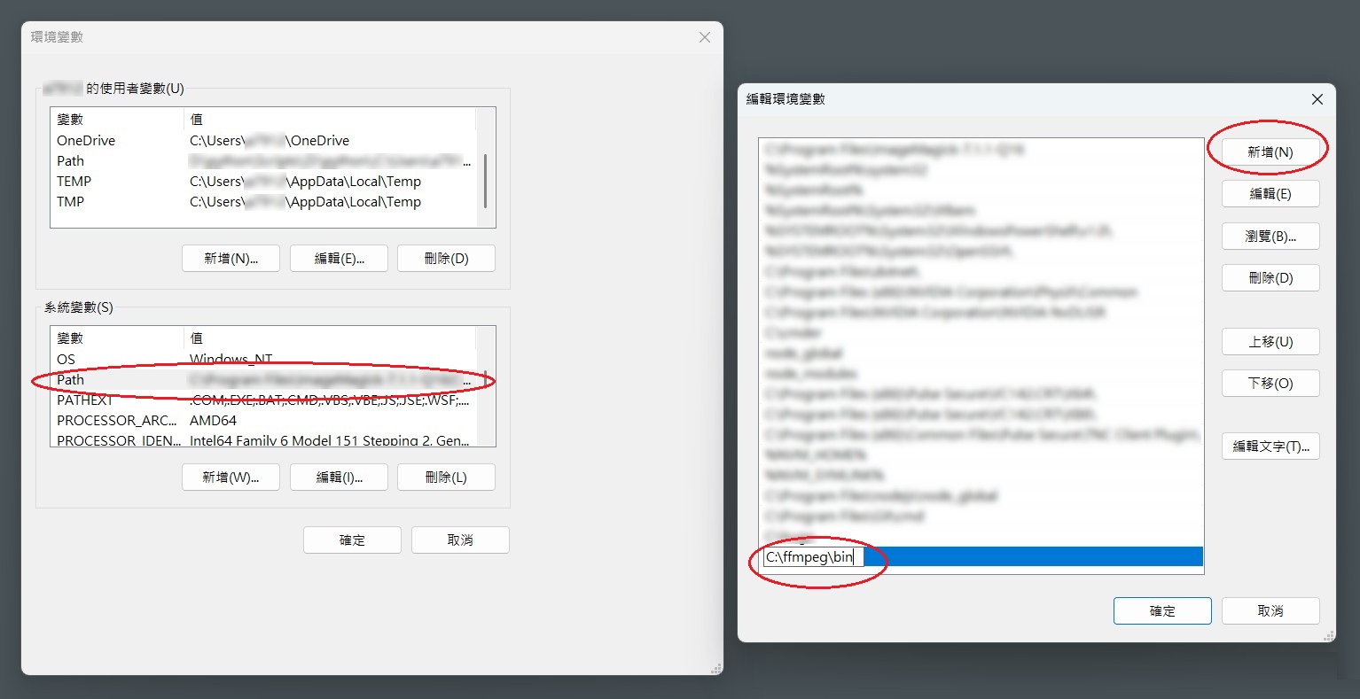 點擊 新增,輸入 C:\ffmpeg\bin > 確定