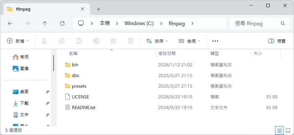 解壓縮資料夾後,修改資料夾名稱為 ffmpeg