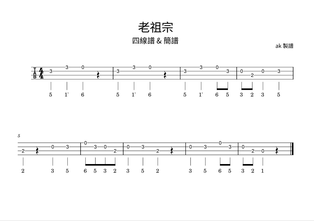 樂譜《老祖宗》烏克麗麗 TAB 四線譜《老祖宗》是最近社群上很紅的中獎神曲,來自於電影《花木蘭》的插曲《Honors to Us All》...《老祖宗》 是最近社群上很紅的中獎神曲來自於電影 《花木蘭》 的插曲 《Honors to Us All》祝大家尾牙都開心中獎 😆非專業,純屬興趣分享,如有錯誤敬請指教