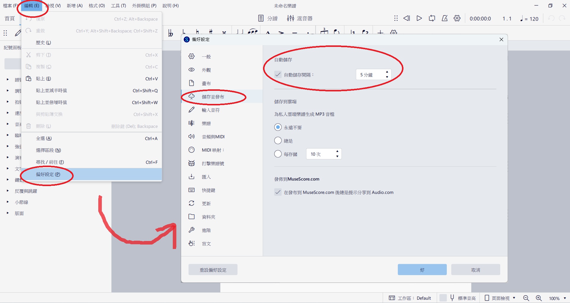 可以到上方選單列 > 編輯 > 偏好設定 > 儲存並發布