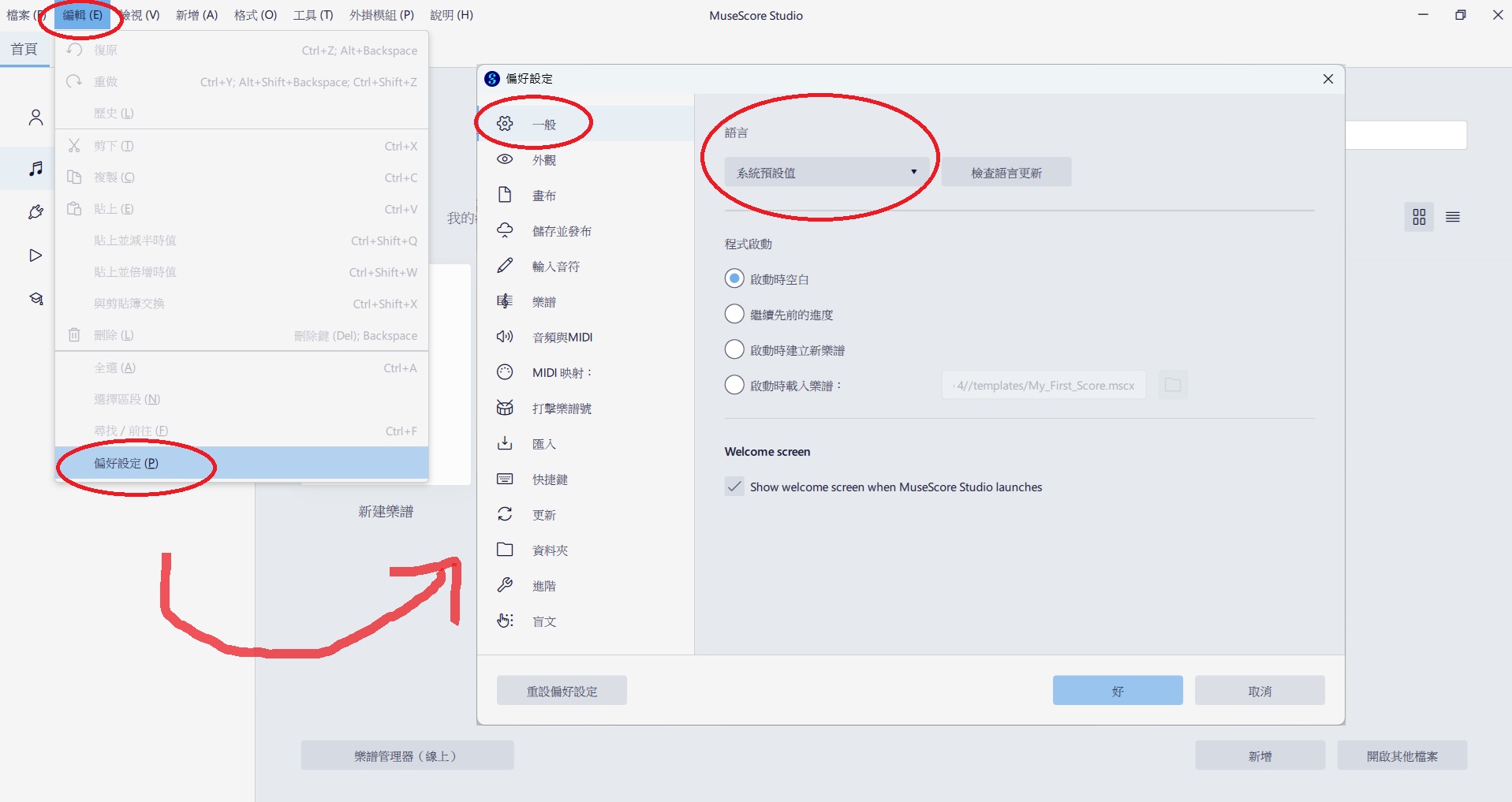 編輯>偏好設定 一般> 從下拉選單選擇你想要的語言