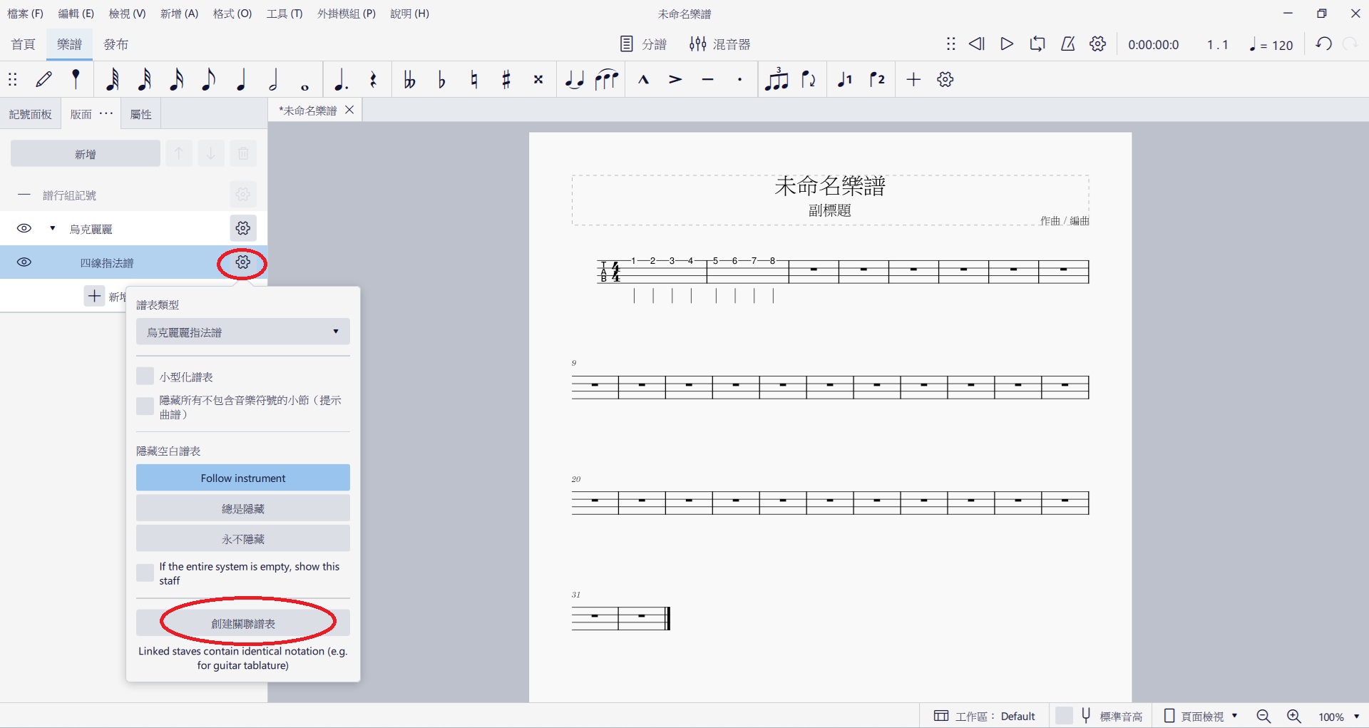 四線指法譜右邊齒輪 > 創建關聯譜表 - 點擊