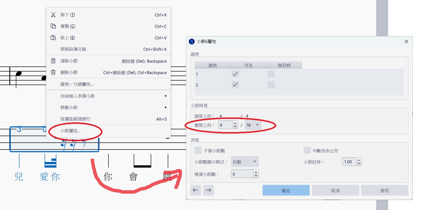 - 亂改之後,發現某幾個小節拍數亂掉,也無法插入音符或休止符?