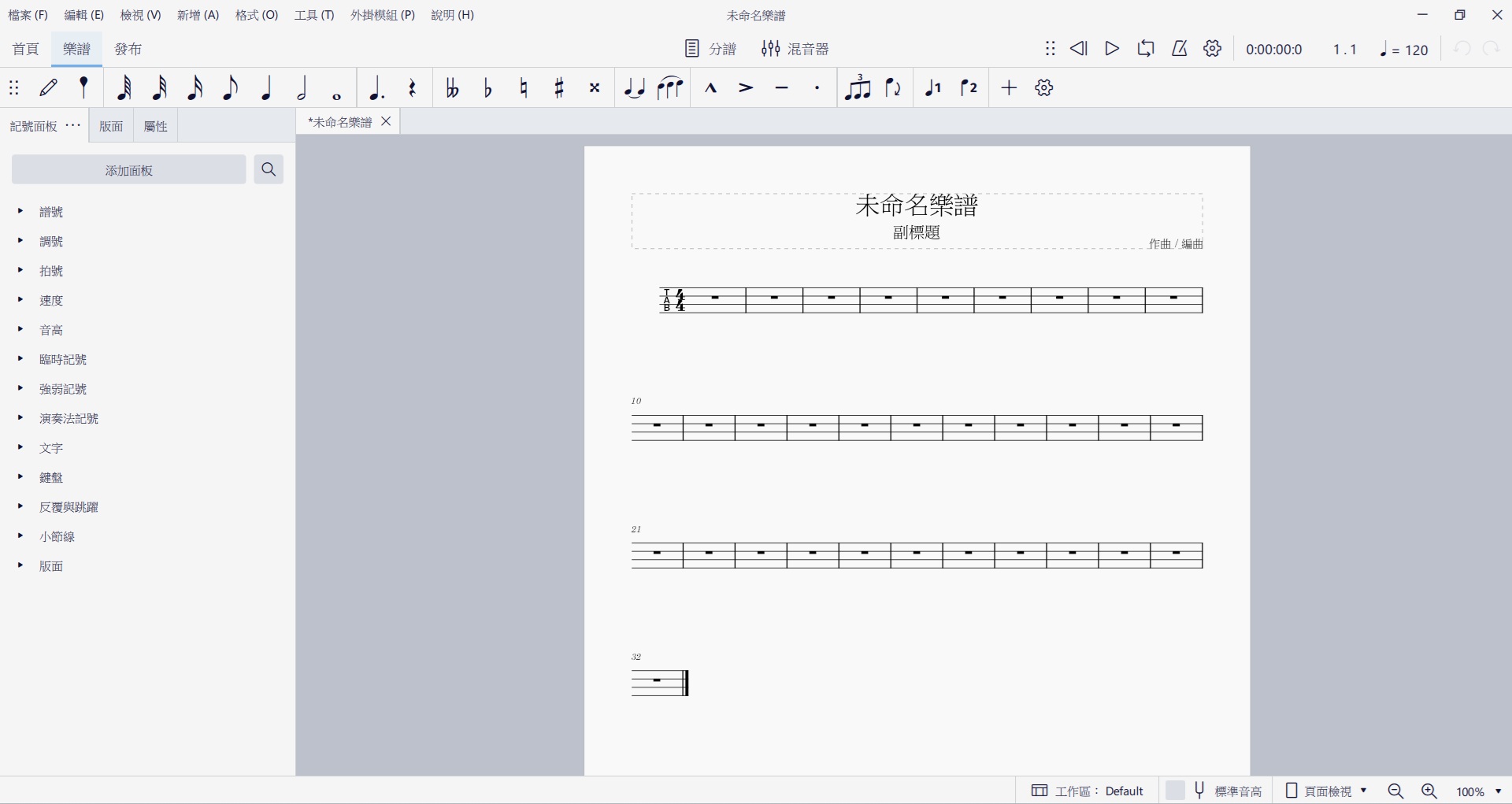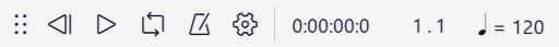 倒帶: 從樂譜(或循環片段)開頭開始播放播放:開始和停止播放循環播放:框選範圍後,點擊可設定循環播放區域;若不框選範圍,則全曲循環播放節拍器:開啟或關閉節拍器播放設定:其他播放控制相關功能播放計數器:顯示播放時間、小節與拍子播放速度:可手動調整播放速度